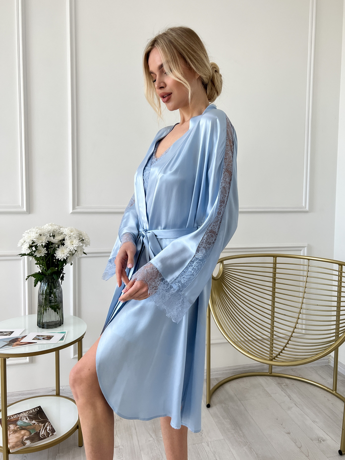 The “Genoa” robe is also in a soft blue hue and has a beautiful design, with beautiful lace details on the sleeves and a belt that accentuates your waist and creates a graceful look.