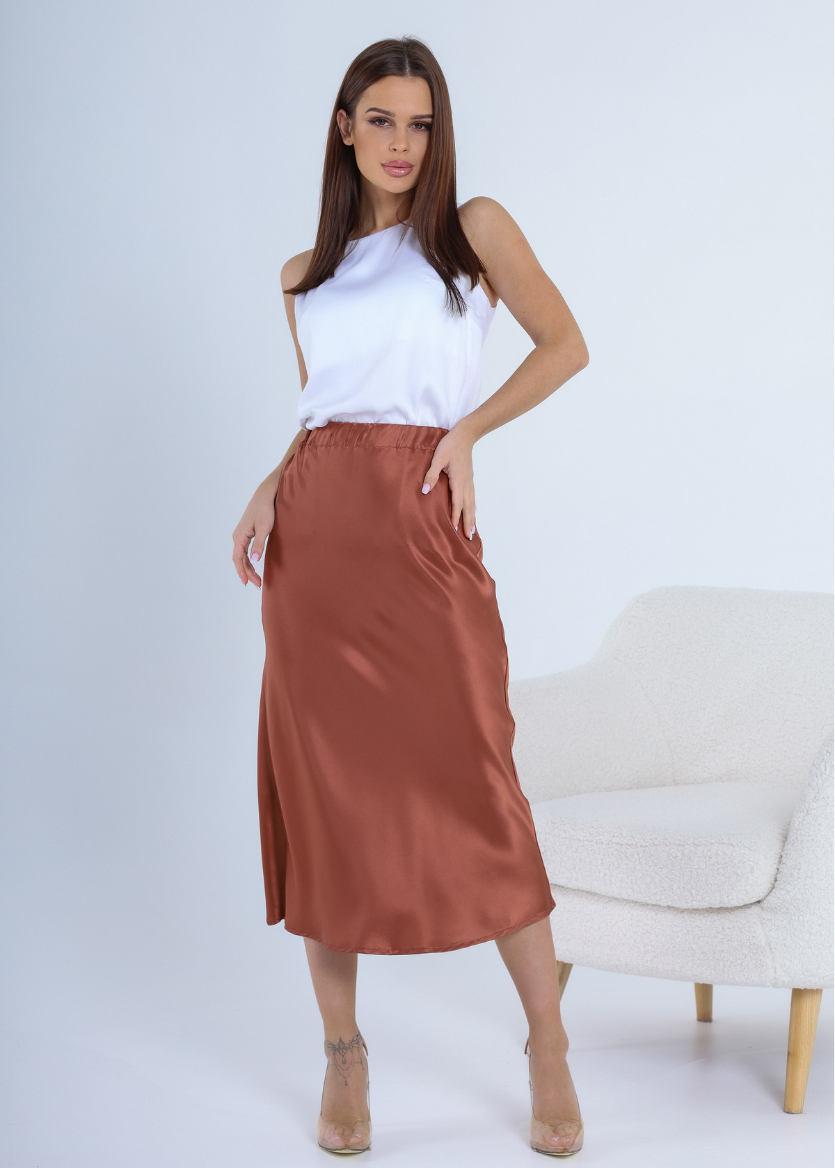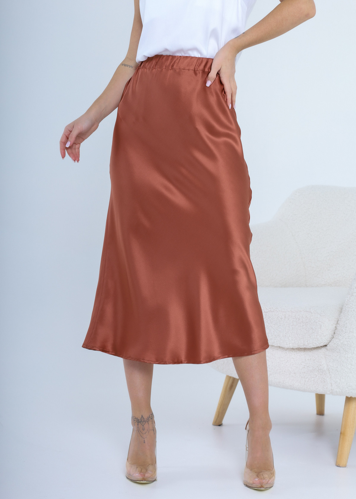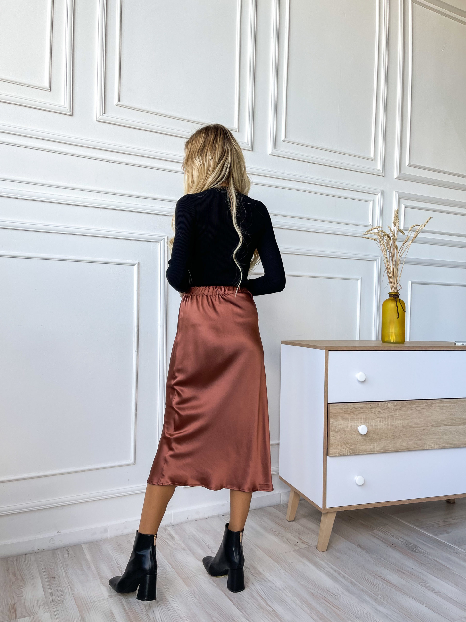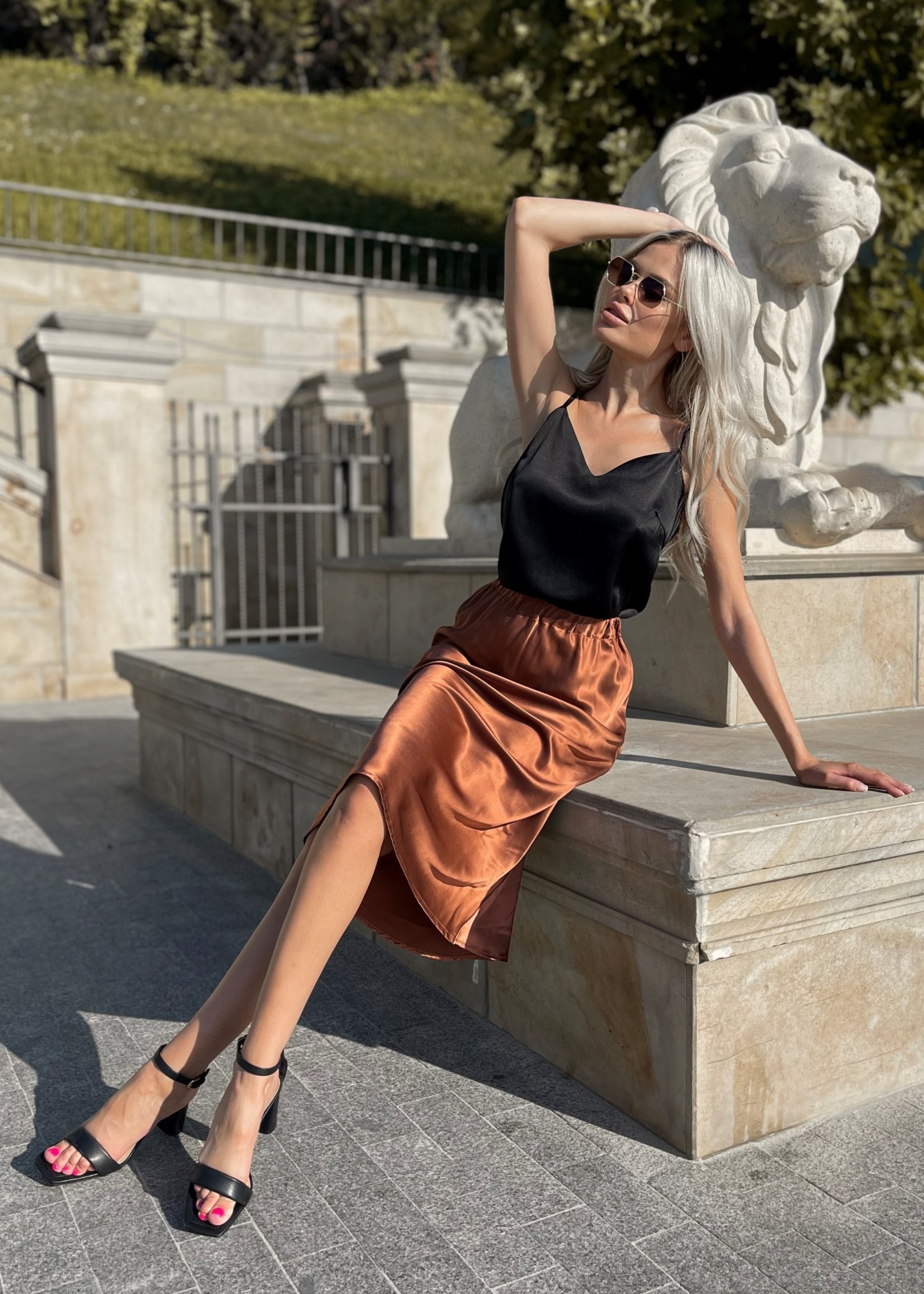 A copper-colored silk skirt from the “Silk Kiss” brand is suitable for serious, self-confident ladies. It can be used in laconic business looks, combining with a silk blouse, jacket and heeled ankle boots. A skirt with a high waist, below the knee length – which can be more versatile in a woman’s wardrobe. Soft flowing silk gracefully envelops the figure, emphasizing its dignity. If a woman in such a skirt sits down, the product will not hesitate, but will lie in seductive shiny folds.